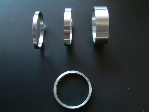 ステンレスのステムコラムのスペーサーです。 写真は28.6mmコラム用で厚さが3mm、5mm、10mmです。 ご希望の寸法で作れます。