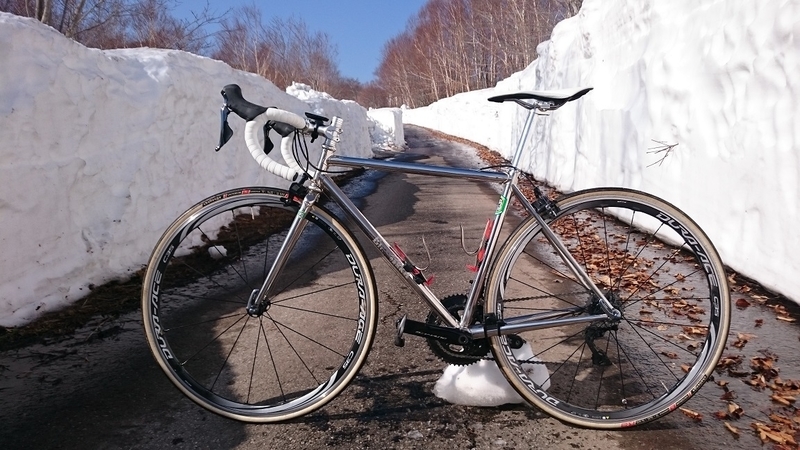 2017-04-20 OWさんからいただきました、宮古の雪の回廊と 無題 #自転車 宮古のOWさんのニューバイク、ハンドメイド展にお借りした953ロードです。 フォークもフレームも953です。 旧宮古市内の最高地点、亀ヶ森に行かれたとの事で、この時期宮古では珍しい雪の回廊の写真をいただきました。 自転車の固定方法が面白いです。 同じ日に亀ケ森を見て、雪が消えたねと言っていたのですが、まさか上っていた人がいたとは思いませんでした、。 春先のヒルクライムにはきつすぎますが、OWさんは宮古一のヒルクライマーでもあるのでさすがです。 帰りに狐と遭遇したそうで、これも珍しいです。 逃げないで餌をねだっていたそうです。 県道40号で会えるかもしれません。 OWさん、ありがとうございます。
